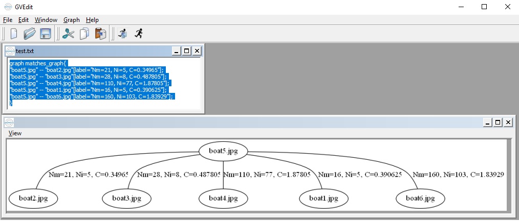 Save matches graph represented in DOT language to test.txt ( --save_graph test.txt) : Labels description: Nm is number of matches, Ni is number of inliers, C is confidence