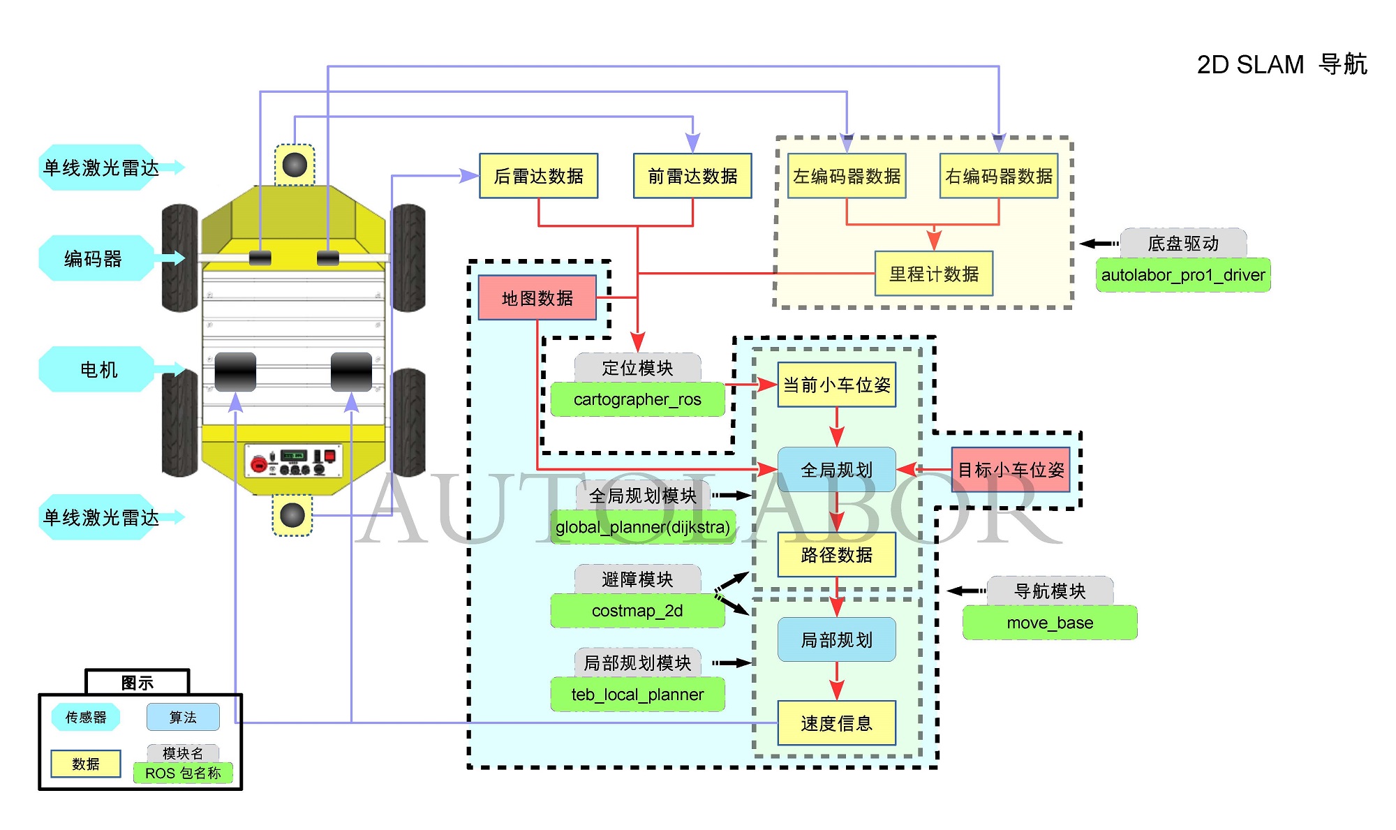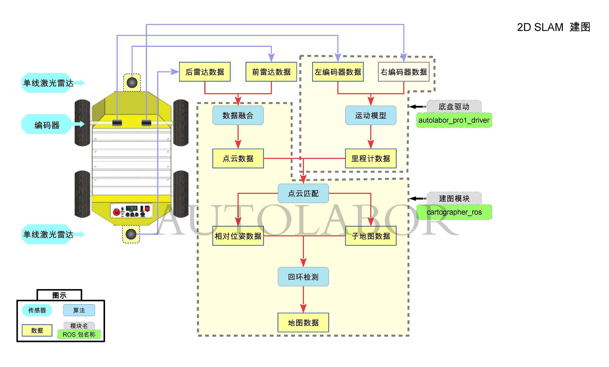 Autolabor SLAM 导航使用的是谷歌开源的 Cartographer,支持多平台和传感器配置,提供2D和3D实时同步定位与建图,使用回环检测消除建图产生的累积误差,建图效果更好,在国内外众多机器人应用上得到了广泛使用。
