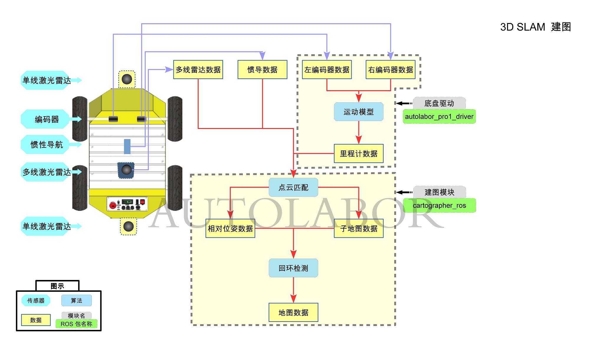 | 3 | 里程计数据 点云数据 | 点云匹配 | 相对位姿数据 子地图数据 | cartographer_ros |