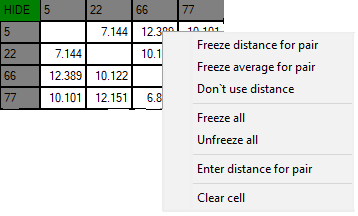 固定标签之间的距离难以自动测量时,可以通过其他方式手动测量标签间的距离然后输入到距离表格,这种情况下距离背景色为绿色。在要修改的距离上右键点击 Enter distance for pair 菜单项完成距离手动输入,如下图。