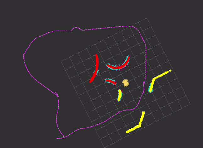 程序打开RVIZ后,可以看到界面中显示了黄色的 AP1 模型代表 AP1,红色的点为前置激光雷达数据,黄色的点为后置激光雷达数据,紫色的路线为录制的轨迹。