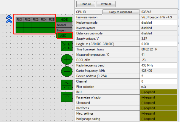- 定位路由连接 Dashboard 后,可在参数列表中查看所有标签的电量(电压),当标签电量过低时界面上会有红色文字提示(满电约为4.2 ),电压不足会影响定位效果。