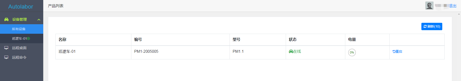 刷新按钮,刷新设备状态 ② 选择对应的设备 ③ 点击启动启动后得到远程命令地址: cloud.autolabor.com.cn 端口:xxxxx
