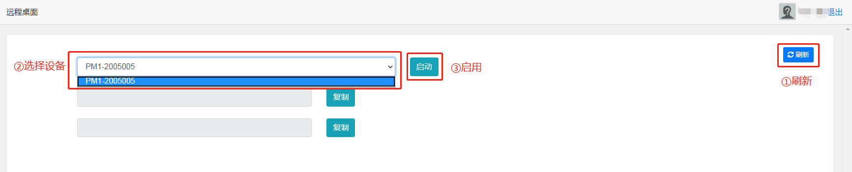 刷新按钮,刷新设备状态 ② 选择对应的设备 ③ 点击启动启动后得到远程桌面地址:cloud.autolabor.com.cn 端口:xxxxx