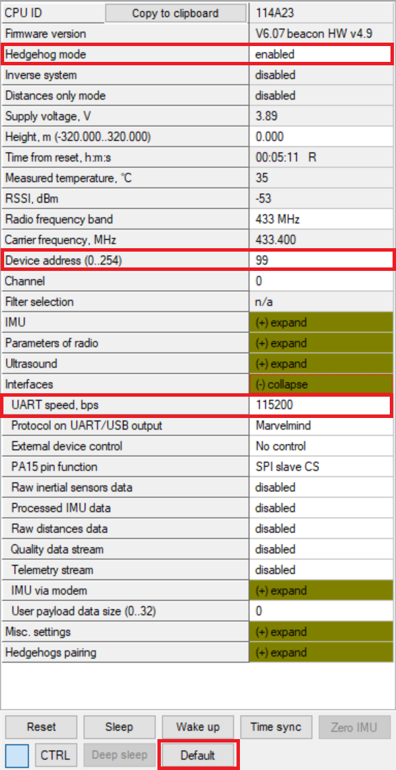 初始化车载定位标签 首先执行上一步操作初始化标签,接着配置 Hedgehog mode 设置为 enable,将配置 Interfaces 的第一个子项 UART speed 设置为115200。