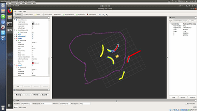 程序打开RVIZ后,可以看到界面中显示了黄色的 AP1 模型代表 AP1,红色的点为前置激光雷达数据,黄色的点为后置激光雷达数据,紫色的路线为录制的轨迹。