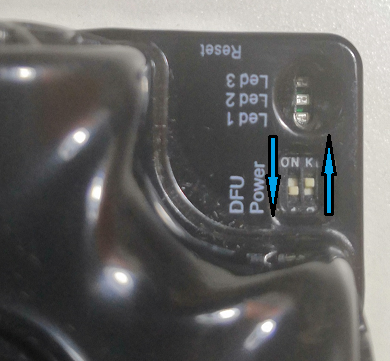 两个拨码开关DFU 保持远离 LED 指示灯,右侧 为电源开关/ Power拨到靠近 LED 指示灯位置为开。