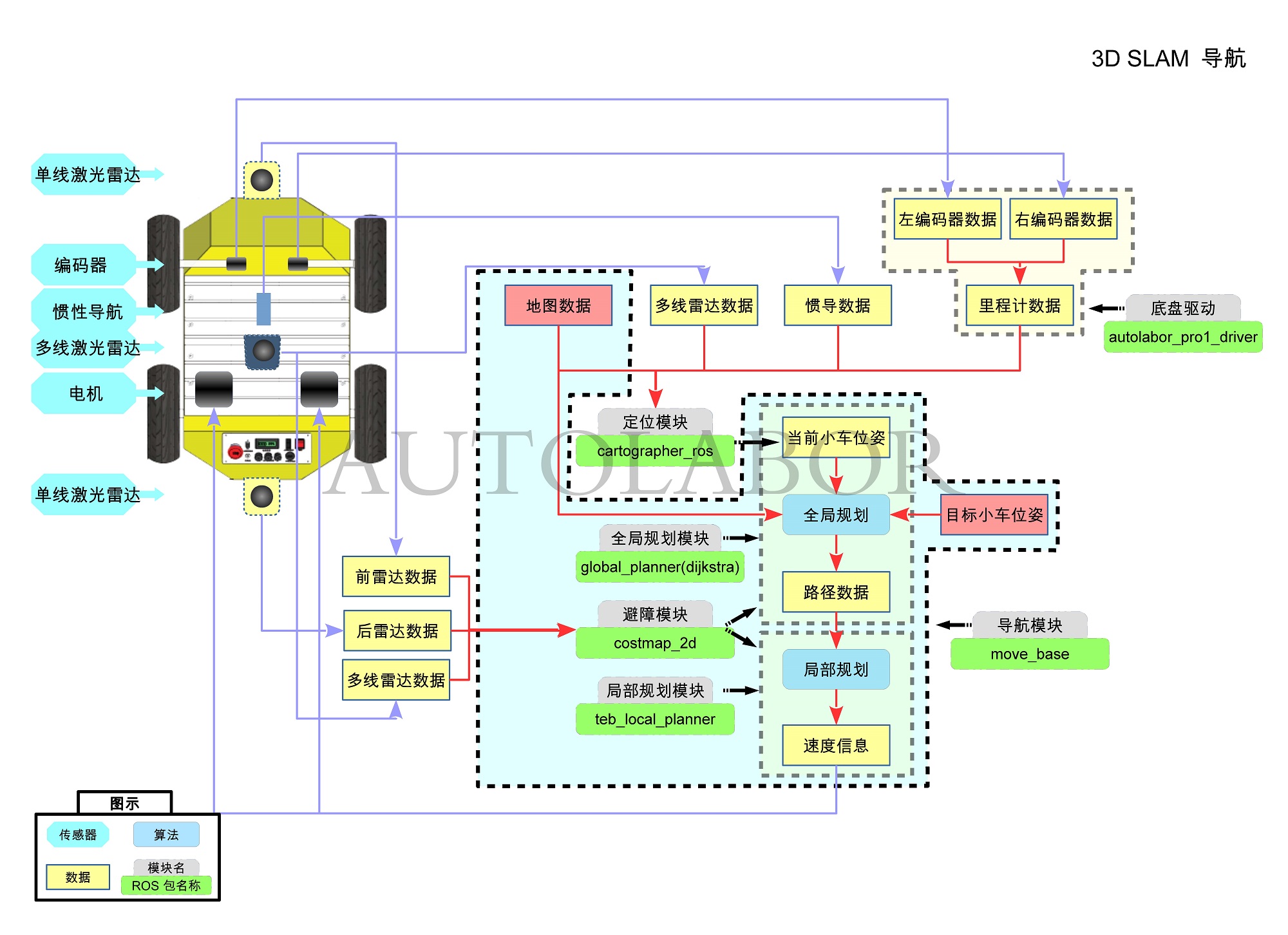Autolabor SLAM 导航使用的是谷歌开源的 Cartographer,支持多平台和传感器配置,提供2D和3D实时同步定位与建图,使用回环检测消除建图产生的累积误差,建图效果更好,在国内外众多机器人应用上得到了广泛使用。