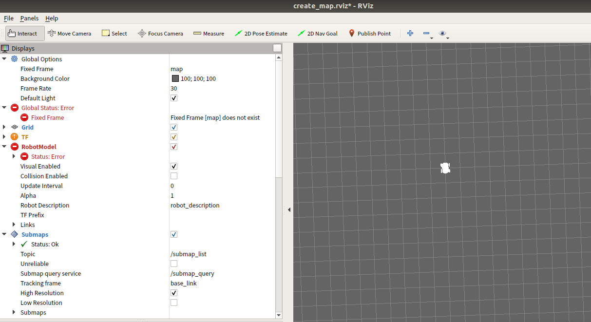 2. 打开开始建图RVIZ中只有一个黄色的车左侧警告 No map receievd