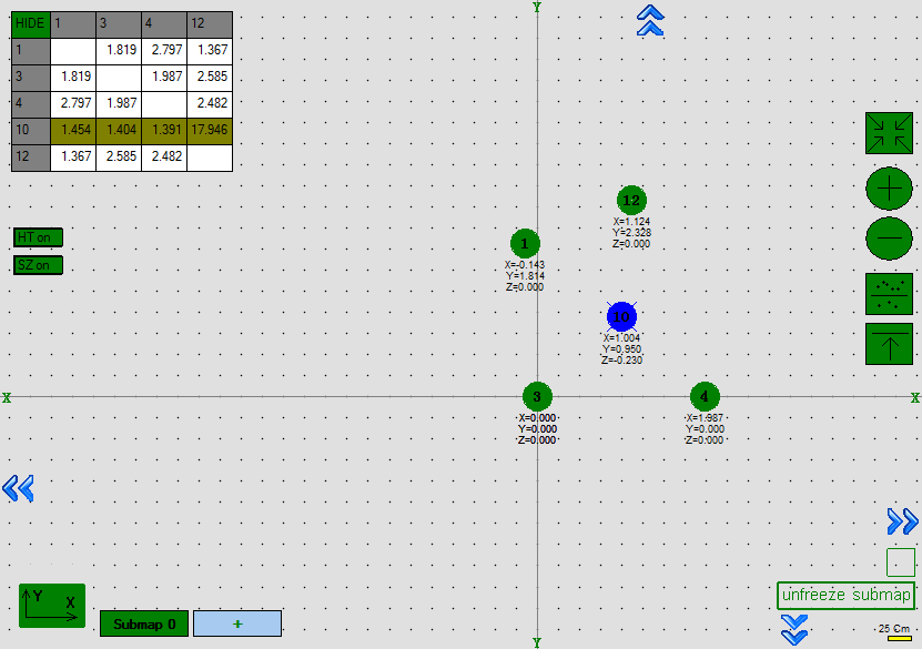 1. 地图会自动构建。等待地图显示中四个绿色固定信标位置基本不再变化、左上角距离表全部为白色、且 freeze map 按钮上方显示橙色 Freeze submap! 字样后,点击 freeze map 按钮锁定地图。