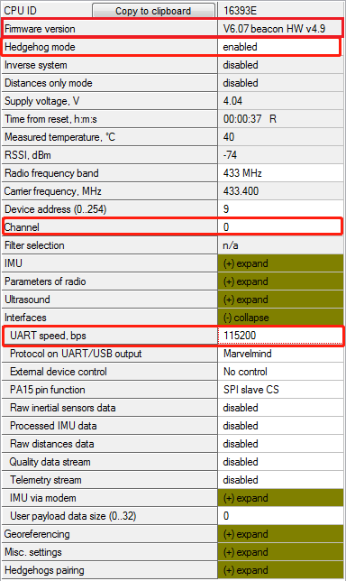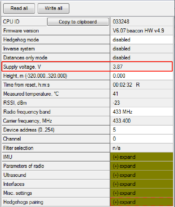 - 定位路由连接 Dashboard 后,可在参数列表中查看所有标签的电量(电压),当标签电量过低时界面上会有红色文字提示(满电约为4.2 ),电压不足会影响定位效果。