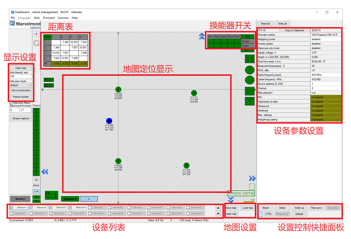 使用 Dashborad 软件对定位标签或路由进行设置、构建地图以及查看可视化定位结果。软件界面如下图所示