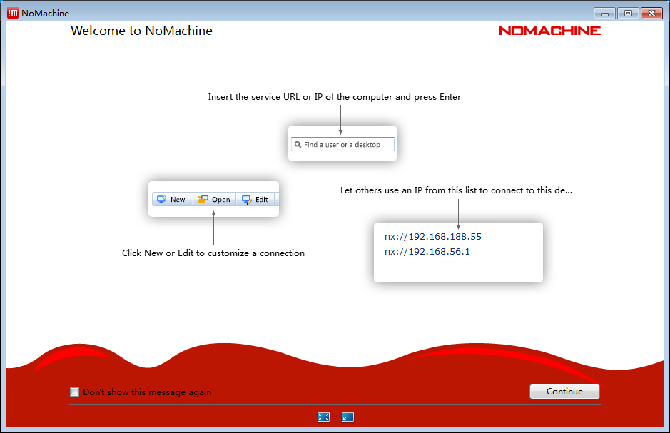 1. 打开 NoMachine 软件,会弹出引导页面,点击 continue